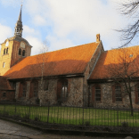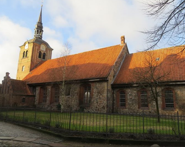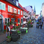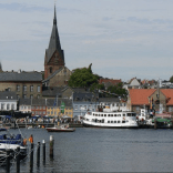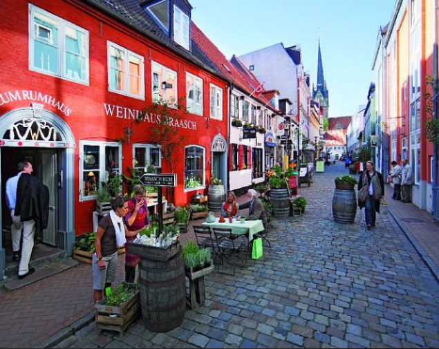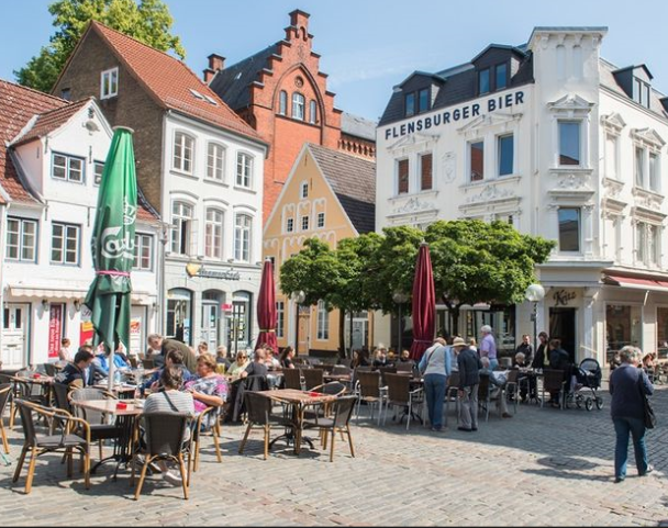 [ A market street in Flensburg ; Flensburg Harbor at dusk ; A 1911 painting of well-known Flensburger Emily Hennings by Hanns Bolz ; Johanneskirche in Flensburg ]