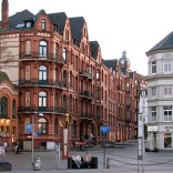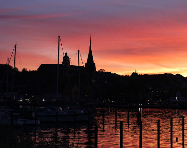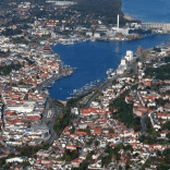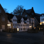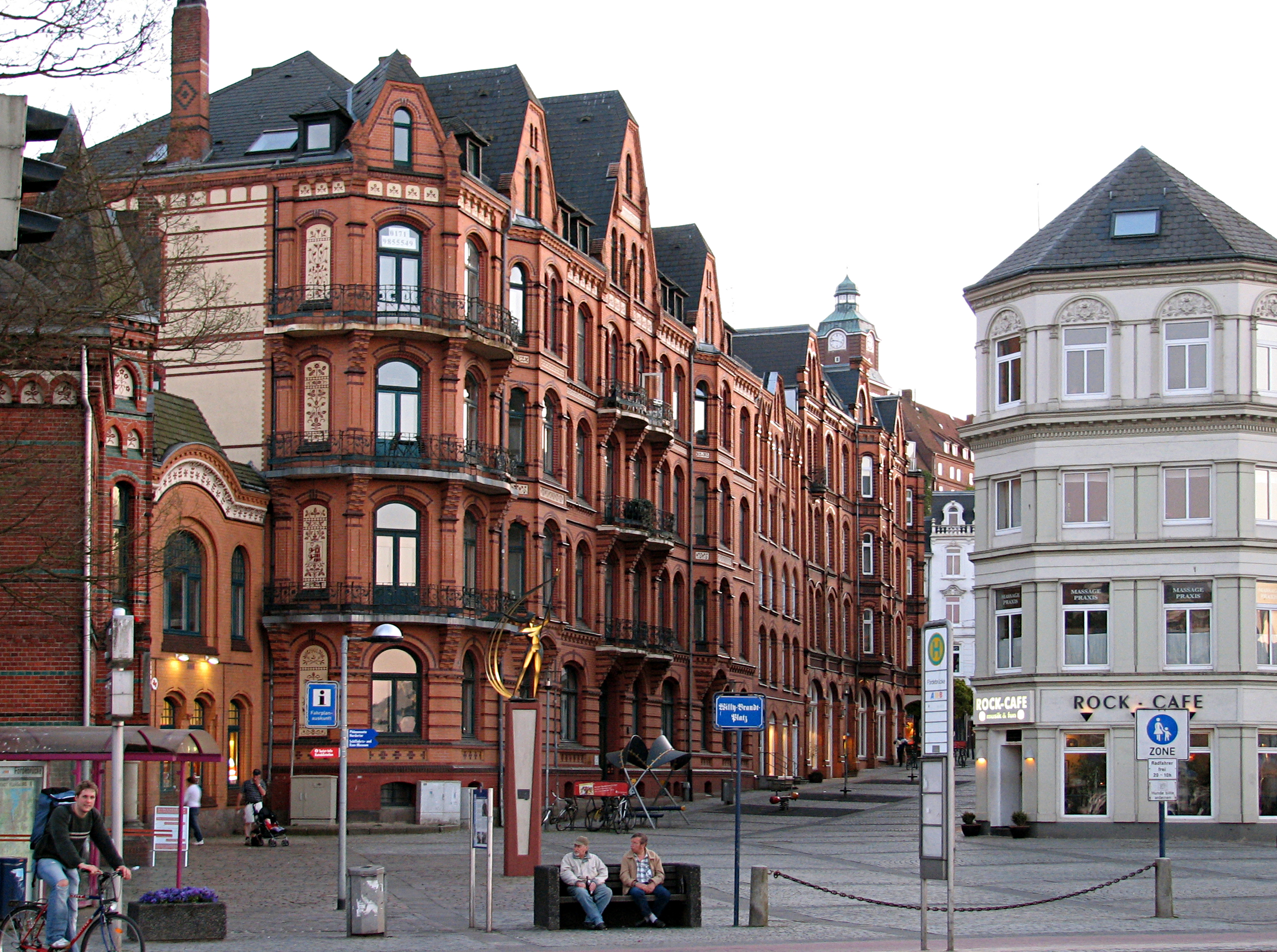 [ Elvira Madigan, born in Flensburg, was a famous circus performer and tightrope walker. In 1889 she met her tragic end in a double suicide with a Swedish nobleman whose heart she captured, their affair doomed because of incompatible social standings ; Flensburg aerial view ; Cobblestone streets at Willy Brandt Platz ; Nightfall at Flensburg’s Nordmarket ]