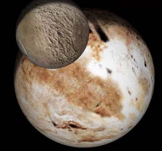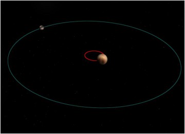 Pluto and it’s nearly half-as-large moon, Charon, wobble around each other a bit like a double star system. Any two celestial bodies with stable gravitational effect upon one another both orbit around a central point called the barycenter. Usually, at least in our solar system, this barycenter is located inside the larger celestial object (as is the case with the earth and moon), but not always. It depends upon the relative sizes, masses, and distances between the two bodies.