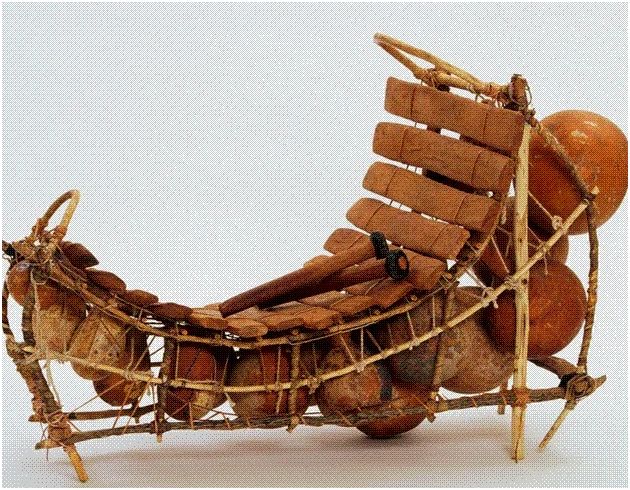 The final musical instrument I’ll describe is the balafon, which can be found across Mali, Ghana, and even west into Senegal. There is one similarity between koras and balafons, namely that the sounds they emit are quite unexpected given their appearances. Aside from this they are very different instruments. Balafons are xylophones with usually three octaves worth of wooden keys. The keys are carved from various tropical hardwoods and cut roughly to the correct size before being tuned with the artisan carefully hollowing out a groove on the underside of the key. This raises the pitch, so the wooden slabs must start out tuned a little lower than the intended note. The keys are arranged on a simple wooden frame, normally rectangular but sometimes arched (which facilitates solo playing). If arranged flat, horizontally, the instrument can be played by two or even three musicians: one per octave. The wooden keys ‘float’ above the frame upon taut strands of animal hide, secured by thin cord, allowing them to ring out without dullness when struck by simple wooden mallets. The tips of these mallets have balls made of strips of glued rubber, allowing them to bounce off the wooden keys enroute to their next target. To amplify the volume and support the resonance, each key is provided with a tuned gourd hanging beneath it. The size of these gourds are calibrated to the note produced by it’s key, and sometimes musicians will tune a gourd by melting a little wax into it’s interior. This entire contraption makes for a surprising buzzy almost electronic sound when the balafon is well-played. When several players are working on the same balafon, the cross-melodies can be intricate and dancibly rhythmical. Musicians will often sing to accompany themselves, and balafons also frequently appear in ensembles with various drums. Villages will always have a few on hand for special ceremonies or celebrations.