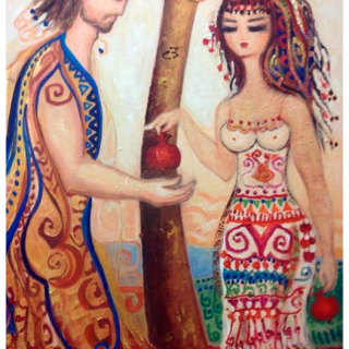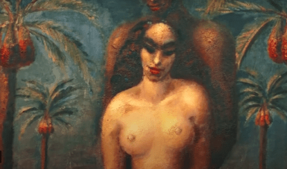 [ Images : (1) Cut from the nicely done 2016 sci-fi film “Arrival” which deals not only with a spectacular alien encounter, but convoluted inquiries into the nature of language, perception, and time. Recommended! (2) Detail from painting by contemporary Turkish artist Cecan Berber imagining the forbidden fruit of earthly knowledge as a pomegranante. (3) Detail from Egyptian artist Mahmoud Said’s mysterious depiction of the moment of decision in Eden. ] (link1)(link2)(link3)