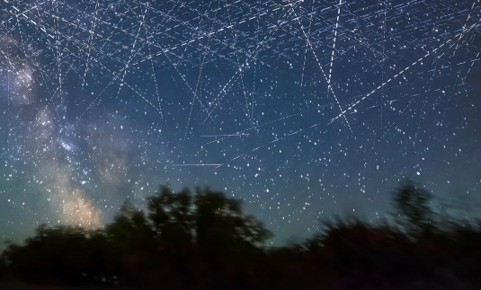 [ Images : (Top Of Post) a recent ‘unplanned de-orbit & disassembly incident’ of a Starlink satellite; (End Of Post) a half-hour time exposure capturing satellite intrusions in front of stars and planets taken from a March 2026 Scientific American article. ]