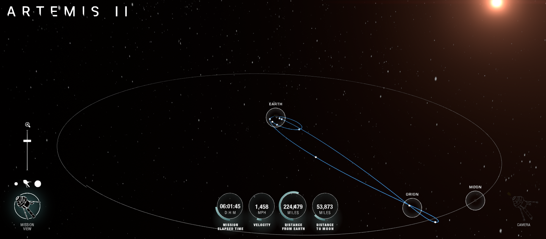 [ Image: screenshot from NASA’s little free online app which permits one to track the progress of the recent Artemis II mission in which four astronauts travelled beyond the dark side of the moon. A simple but cool app which let you alter perspective and direction and see the craft or the overall flight path while also seeing the positions of the sun, moon, and earth. ]