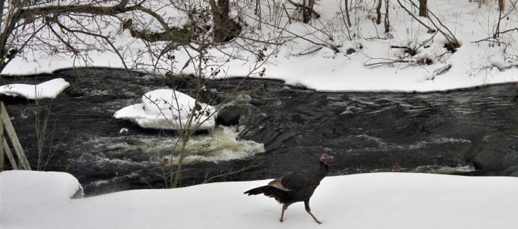 A family of five wild turkeys dwelt in this valley last spring, three newborn chicks, one albino. Watched them grow, seen often through the summer. Then their homelands were invaded by an aggressor troop eighteen strong. Occasional brief territorial squabbles, tribal instincts leading to an uneasy union. Then autumn, more sparseness, but so very resourceful. Leaves winding away, their tree roosts sometimes exposed. Then the snows came, early and unceasing. Till finally, one week, only a last intrepid one was still in evidence.