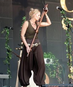 [ 3 fujarists under a crystal sky ; Details of traditional fujara decorative carvings ; Young musician integrating an alto fujara into her performance art ; Dushan Holik, selling his musical wares ]